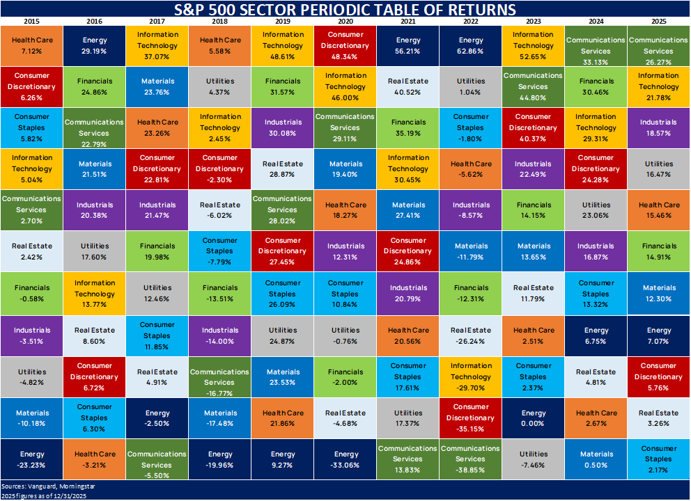 This chart contains the 11 sectors that constitute the S&P 500 Index. Each sector is given a unique color, and each column is organized from highest return (top) to lowest return (bottom), for a given year. The first 10 columns display annual performance for each sector from 2015 to 2024. The last column on the right illustrates year-to-date (YTD) performance, as of 12/31, for 2025.
