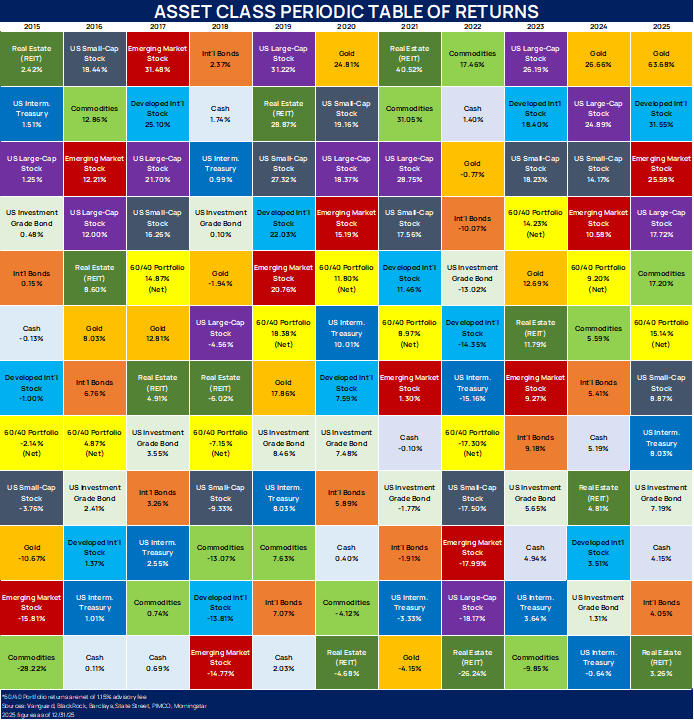 This chart is composed of 11 standard asset classes and an example of a diversified 60% stock and 40% bond portfolio. Each asset class is given a unique color, and each column is organized from highest return (top) to lowest return (bottom), for a given year. The 60/40 portfolio (in bright yellow) generally falls somewhere in the middle, helping to illustrate how a diversified portfolio can reduce volatility. The first 10 columns display annual performance for each asset class from 2015 to 2024. The last column on the right illustrates year-to-date (YTD) performance, as of 12/31, for 2025.