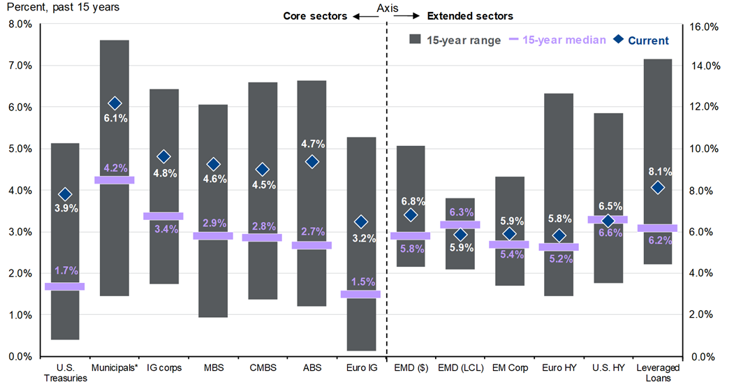 Source: Bloomberg, FactSet, J.P. Morgan Credit Research, and J.P. Morgan Asset Management. Data shown represents yield to worst across fixed income sectors over the past 15 years. Yield to worst reflects the lowest potential yield assuming a bond is called or redeemed prior to maturity and all payments are made as scheduled. Past performance and historical yield ranges are not indicative of future results. Yields and market conditions are subject to change without notice. The chart illustrates historical ranges, medians, and current yields for selected fixed income sectors. Core and extended sector classifications are for illustrative purposes only and do not represent investment recommendations. Indexes are unmanaged and do not reflect the deduction of fees or expenses. Investors cannot invest directly in an index. Municipal bond yields are shown on a tax equivalent basis and assume the highest federal marginal tax rate plus applicable Medicare surtax. Credit risk, interest rate risk, liquidity risk, and other factors may affect fixed income performance. Higher yielding sectors may carry greater risk, including increased volatility and potential loss of principal. This material is provided for informational purposes only and should not be considered investment advice or a recommendation to buy or sell any security. Individual investment decisions should be made in the context of an investor’s financial situation, objectives, and risk tolerance.
