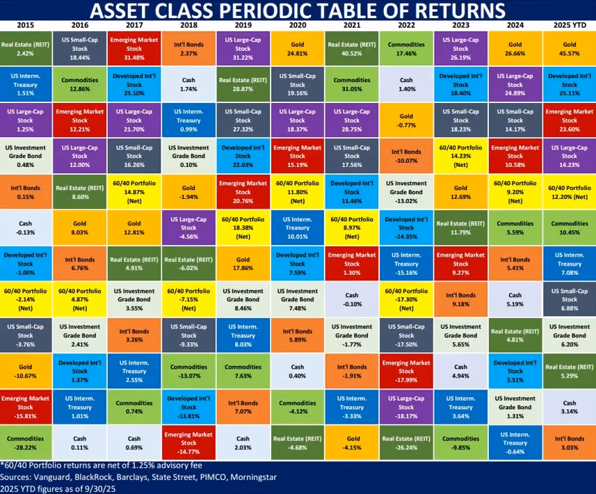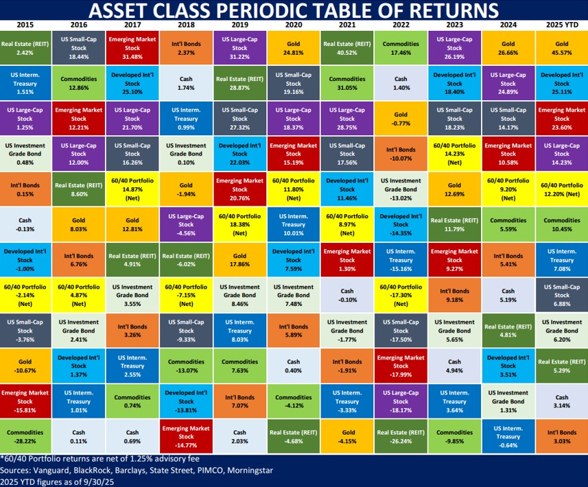 This chart is composed of 11 standard asset classes and an example of a diversified 60% stock and 40% bond portfolio. Each asset class is given a unique color, and each column is organized from highest return (top) to lowest return (bottom), for a given year. The 60/40 portfolio (in bright yellow) generally falls somewhere in the middle, helping to illustrate how a diversified portfolio can reduce volatility. The first 10 columns display annual performance for each asset class from 2015 to 2024. The last column on the right illustrates year-to-date (YTD) performance, as of 9/30, for 2025.